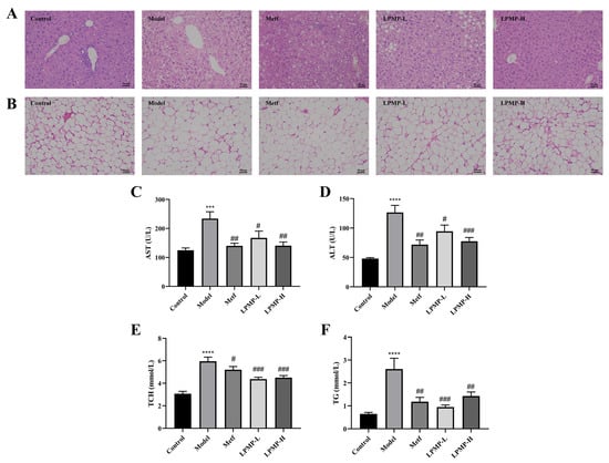Effect of LPMP on the pathological changes of liver (A) and adipose (B) tissue. H&E staining was conducted to observe the pathological changes under 200× magnification. Control: 5 mL/kg/day water; Model: 5 mL/kg/day water; Metf: 225 mg/kg/day metformin; LPMP-L: 20 mg/kg/day LPMP; LPMP-H: 100 mg/kg/day of LPMP. Serum levels of AST (C), ALT (D), TCH (E), and TG (F) in diabetic mice. The results shown are means ± SEM (n = 8). **** p < 0.001, *** p < 0.001 versus control group; # p < 0.05, ## p < 0.01, ### p < 0.001 versus model group.