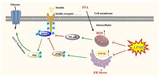 Insulin receptor substrate-1 (IRS-1) is an essential insulin receptor substrate in the insulin signaling pathway, and it plays a vital role in insulin signaling []. In response to insulin stimulation, the tyrosine residue site of IRS-1 is phosphorylated and is enabled to bind to phosphatidylinositol-3 kinase (PI3K) proteins containing the Src-homologous 2 (SH2) domain []. Then, PI3K recruits the protein kinase B (PKB/Akt) protein to the cell membrane, and its tyrosine residues are phosphorylated []. Dephosphorylation of tyrosine residues of IRS-1 and Akt may inactivate the entire process of insulin signaling, leading to insulin resistance []. Noteworthily, oxidative stress is the toxic effect of free radicals that occurs when the generation rate of free radicals exceeds the anti-oxidant defense system. It induces activation of pathways such as NF-κB, JNK/SAPK, and MAPK signaling []. These stress-activated signaling pathways also play a remarkable role in the development and progression of insulin resistance [,]. Moreover, endoplasmic reticulum (ER) stress is caused by the buildup of unfolded and misfolded proteins within the lumen of the endoplasmic reticulum, resulting in perturbations within the endoplasmic reticulum homeostasis []. Endoplasmic reticulum stress activates a sign cascade known as the unfolded protein response (UPR) and triggers a series of transcriptional and translational events that promote cell survival and adaptation []. Existing preclinical and clinical proof demonstrates that prolonged endoplasmic reticulum stress will increase the danger of metabolic disorders, such as T2DM, obesity, and dyslipidemia [].