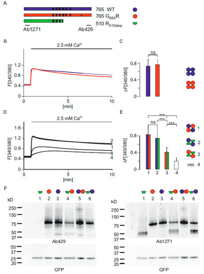 TRPV6 activity is reduced in HEK293 cells expressing mutant TRPV6 subunits present in the affected child. (A) TRPV6 constructs used for Ca2+ imaging and Western blots, TRPV6 WT (blue), TRPV6-G660R (red) and TRPV6 R510stop (green). Transmembrane domains (black bars), G660R mutation (*) and binding sites for TRPV6 specific antibodies 1271 and 429 are indicated. (B,C) Ca2+ imaging of TRPV6 WT (blue, n/N = 132/3) and TRPV6-G660R (red, n/N = 126/3) in HEK293 cells and statistical analysis of the peak values. Circles indicate TRPV6 subunits. (D,E) Coexpression of TRPV6 WT-I-GFP and TRPV6-G660R-I-RFP, which reflects the maternal TRPV6-genotype (1, blue/red, n/N = 117/3), coexpression of TRPV6 WT-I-RFP and TRPV6-R510stop mutant I-GFP, which reflects paternal genotype (2, blue/green, n/N = 72/3), coexpression of TRPV6-G660R-I-RFP and TRPV6-R510stop mutant I-GFP, which reflects the child (3, red/green, n/N = 87/3), vector control (4, white, n/N = 82/2) and statistical analysis of peak values. n/N = cells/experiments. Asterisks assign significance differences (*** p < 0.001, ns = not significant). (F) Western blots of cells expressing TRPV6 constructs in HEK293 cells: lane1 TRPV6-R510stop mutant (green semicircle), lane2 TRPV6-G660R mutant (red circle), lane 3 TRPV6 WT (blue circle), lane 4 coexpression of TRPV6-R510stop and G660R mutants, lane 5 coexpression of TRPV6 WT and G660R mutant, lane 6 coexpression TRPV6 WT and TRPV6-R510stop mutant. All TRPV6 variants were expressed as I-GFP constructs. Western blot was probed with antibody 429 (left) and antibody 1271 (right). GFP control below.