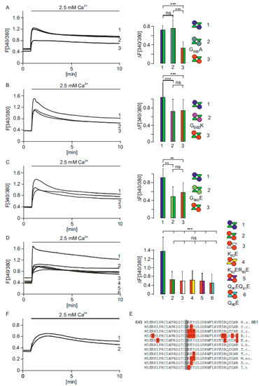 A TRPV6-G660A mutation rescues the G660R mutation. (A) Calcium imaging of cells coexpressing TRPV6 WT-I-GFP and TRPV6-R510stop-I-RFP (1, blue/green, paternal, n/N = 95/3), TRPV6-R510stop mutant I-RFP and TRPV6-G660A-I-GFP (2, red/grey, n/N = 97/3) and TRPV6-G660R I-GFP and TRPV6-R510stop mutant I-RFP (3, green/red, child, n/N = 91/3) n/N = cells/experiment. (B) Coexpression of TRPV6-R510stop mutant I-RFP and TRPV6-G660K-I-GFP (2, pink/green, n/N = 106/3) compared with the parental combination (1, blue/green, n/N = 79/3) and the child (3, red/green, n/N = 84/3). (C) Similar experiment as shown in (B), coexpression of TRPV6-R510stop mutant I-RFP and TRPV6 G660E-I-GFP (2, light green/green n/N = 55/3), compared with the parental combination (1, blue/green n/N = 65/3) and the child (3, red/green n/N = 44/3). (D) Coexpression of the TRPV6-G660R-I-RFP with several TRPV6-R510stop mutants cloned in I-GFP vectors, which, in addition, contain a second mutation within the N-terminal located sequence QQKR83. This sequence interacts with the C-terminal sequence in which the G660 residue is located. The following mutants were tested: K82E (3, red/white, n/N = 50/3), K82ER83E (4, red/yellow, n/N = 44/3), Q80EQ81E (5, red/magenta, n/N = 65/3), and Q80E (6, red/light blue, n/N = 45/3). The mutants were compared with the parental combination (1, blue/green, n/N = 52/3) and the child (2, red/green, n/N = 47/2). Here, n/N = cells/experiments. Asterisks assign significance differences (** p < 0.01, *** p < 0.001, ns = not significant). (E) Alignment of mammalian TRPV6 protein sequences from amino acid 643 to 681. G660 is strictly conserved (grey). H.s., Homo sapiens; O.c., Oryctolagus cuniculus; S.s., Sus scrofa; B.i., Bos indicus; E.a., Equus asinus; S.b., Saimiri boliviensis; Z.c., Zalophus californianus; T.c., Tupaia chinensis; M.mo., Monodon Monoceros; D.o., Dipodomys ordii; I.t., Ictidomys tridecemlineatus. (F) Expression of artificial TRPV6 construct which contains amino acids 510 to 765 (1, n/N = 117/3) and coexpression with the same construct and the TRPV6-R510stop mutant (2, n/N = 70/3).