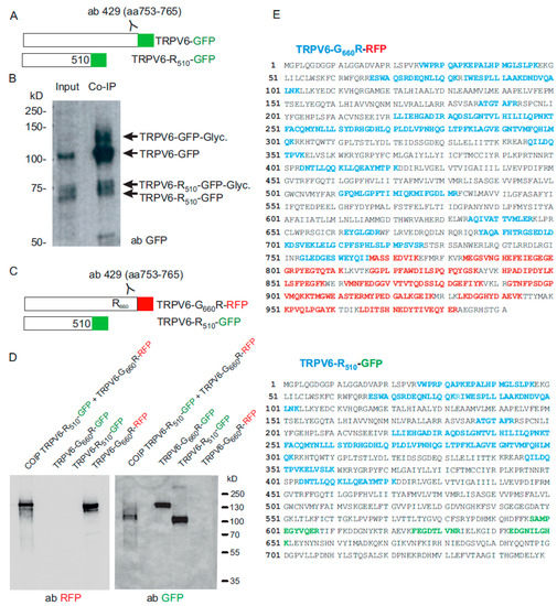 The previous experiment requires the assumption that the truncated stop mutant can still interact with the G660R mutant. This assumption is supported by the finding that the N-terminal ankyrin repeats which are important for the multimerization of the TRPV6 channel, are also present in the truncated mutant [23]. In addition, we performed a coimmunoprecipitation experiment, which shows that the truncated TRPV6 present in the child can interact with the full length TRPV6 protein (Figure 3A,B). We fused GFP to TRPV6 resulting in TRPV6-R510-GFP and TRPV6-GFP. As shown earlier by Hirnet and coworkers, the TRPV6 protein occurs as glycosylated and non-glycosylated protein [24]. The glycosylation site is located in between transmembrane S1 and S2, and is present in the full length TRPV6 as well as in the truncated TRPV6-R510-GFP variant. The TRPV6 protein was fished with the TRPV6 specific antibody 429, which binds to the C-terminus of TRPV6, and the co-immunoprecipitate (COIP) was analysed on a Western blot with a GFP antibody. Both proteins, TRPV6-R510-GFP and TRPV6-GFP, as well as glycosylated forms, were detected by COIP, which shows that both proteins interact. Another COIP experiment using TRPV6-G660R-RFP and TRPV6-R510-GFP fusion proteins also shows that the mutant variants present in the affected child can interact (Figure 3C,D). The interaction of both fusion protein was also confirmed by mass spectrometry (Figure 3E).