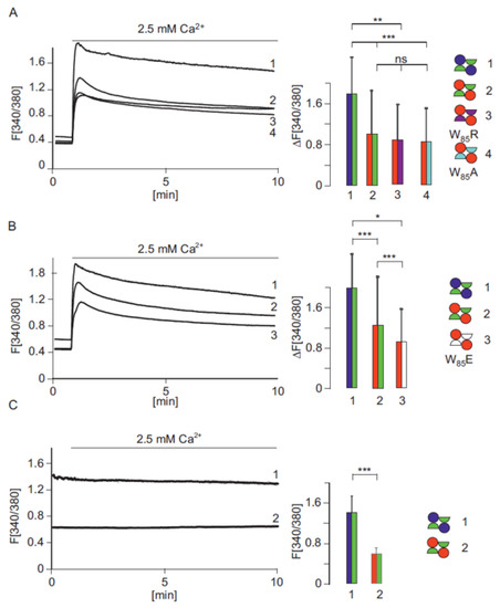 (A,B) Coexpression of TRPV6-G660R-I-RFP with several TRPV6-R510stop mutants which, in addition, contain W85 mutations. The tryptophan W85 was mutated to W85R (3, red/magenta, n/N = 47/3), W85A (4, red/light blue, n/N = 92/3), W85E (3 shown in B, red/white, n/N = 98/3) and compared with the TRPV6 combination present in the father (1, blue/green, n/n/N/N = 61/3, 55/3) and the child (2, red/green, n/n/N/N = 60/3, 120/3), respectively. (C) Expression of the TRPV6 combination of parental (1, blue/green, n/N = 48/3) and child (Red/green, n/N = 73/3) after loading FURA-2AM and incubation of the cells in the permanent presence of 2.5 mM Ca2+. n/N = cells/experiments. Asterisks assign significance differences (* p < 0.05, ** p <0.01, *** p < 0.001, ns = not significant).