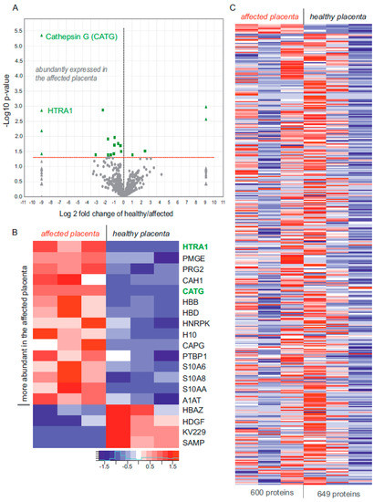 Proteome analysis of paraformaldehyde fixed tissue of a healthy placenta and the placenta of the affected child. (A) Vulcano-blot of a semiquantitative analysis of differentially expressed proteins identified by mass spectrometry of pooled tissue sections of a healthy placenta and the placenta of the affected child (n = 3 samples/genotype). Fifteen proteins are upregulated and four proteins downregulated in the placenta of the affected child. Up- and downregulated proteins were identified based on at least 1.3-fold changes in the total spectrum counts, with p-values < 0.05 using unpaired two-tailed Student’s t-test. Cathepsin G (CATG) and serine protease HTRA1 (green) are only detectable in the affected child. (B) Heatmap of Z-scores calculated from the total peptide spectra counts of proteins (UniProt Identifier), which were more abundant in the child (green triangles and squares shown in (A)). (C) Heatmap of identified proteins on the basis of total spectrum count values (shown as Z-scores) from three independent mass spectrometry samples prepared from placentas from healthy control and affected child (n = 3). In total, 740 proteins were identified by a least two unique peptides/protein of the healthy placenta and the placenta of the affected child.