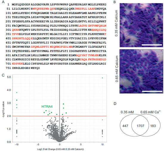 Proteome analysis of BeWo cells cultured in the presence of different Ca2+ concentrations. (A) Tryptic TRPV6 peptides identified by mass spectrometry after immunoprecipitation from BeWo cells (red) with TRPV6 ab 429. (B) BeWo cells were cultured in the presence of 0.65 mM (high) or 0.35 mM Ca2+ (low). Cells were fixed and stained with eosin/azur, scale bar: 200 µm. (C) Total protein identifications in BeWo cells cultured in the presence of high or low Ca2+. (D) Vulcano blot shows semi quantitative analysis of differentially detected proteins identified in BeWo cell lysates. Proteome analysis of the abundance of peptide spectra detected in BeWo cells in the presence of high or low Ca2+. Up- and downregulated proteins were identified based on at least 2-fold changes in the total peptide spectra abundance detected in three independent experiments with a p-value < 0.01, calculated using the unpaired two-tailed Student’s t test. Serine protease HTRA4 is more abundant in BeWo lysates cultured in 0.35 mM Ca2+.