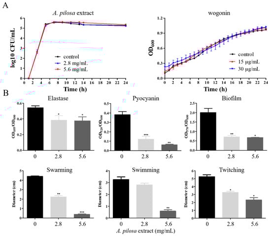 Pyocyanin was analyzed according to the previous report []. Briefly, after growing in Pseudomonas broth medium (0.14%NaCl, 1%K2SO4, and 2% tryptone) with different concentrations of the extract of A. pilosa or wogonin at 37 °C for 24 h, the culture was centrifuged to obtain supernatant. After 3 mL of chloroform was added to 5 mL of supernatant and vigorously vortexed for 2 min, the mixture was centrifuged at 8000 rpm for 10 min. Then, the chloroform layer was transferred to a fresh tube and mixed with 1 mL of 0.2 M HCl. After centrifugation again, the top layer was removed and OD520 was measured. The amount of pyocyanin (μg/mL) was obtained using the formula: OD520/OD600 × 17.072.