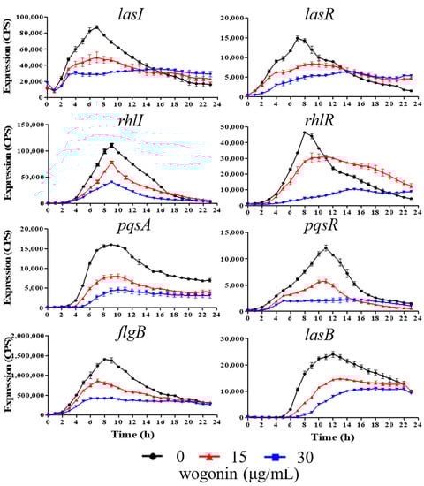 Flavonoids are the most main components of A. pilosa, and wogonin as one family of flavonoids has been used to suppress inflammatory responses []. We speculated that wogonin might be involved in the anti-QS activity of A. pilosa. To examine our speculation, the effects of wogonin on the expression of QS-related genes were first detected. The results showed that 15 μg/mL and 30 μg/mL wogonin inhibited the expression of five genes including rhlI, pqsA, pqsR, flgG, and lasB during a 24-h period and reduced the expression of three genes lasI, lasR, and rhlR before ~12 h but not after 12 h (Figure 2). In addition, 15 μg/mL and 30 μg/mL wogonin had no significant effects on PAO1 growth (Figure 1A). The results were similar to those of the crude extracts of A. pilosa, indicating that the active ingredient observed in the above-mentioned phenomena might be wogonin.