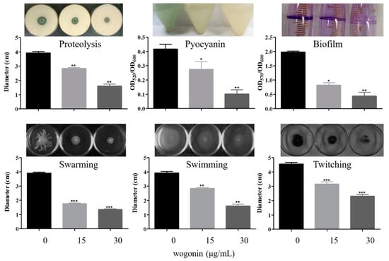 The effects of wogonin on P. aeruginosa PAO1 virulence factors, including proteolysis, pyocyanin, biofilm, swarming, swimming, and twitching. The wogonin concentrations used were 0, 15, and 30 μg/mL, respectively. The error bars represent standard errors. *, p < 0.05; **, p < 0.01; ***, p < 0.001.
