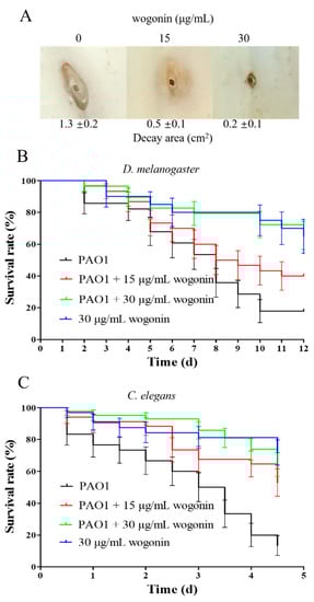 The pathogenicity of PAO1 with or without wogonin application was investigated using Chinese cabbage (B. pekinensis), fruit fly (D. melanogaster Canton S), and nematode (C. elegans N2) infection models as reported previously [,,].