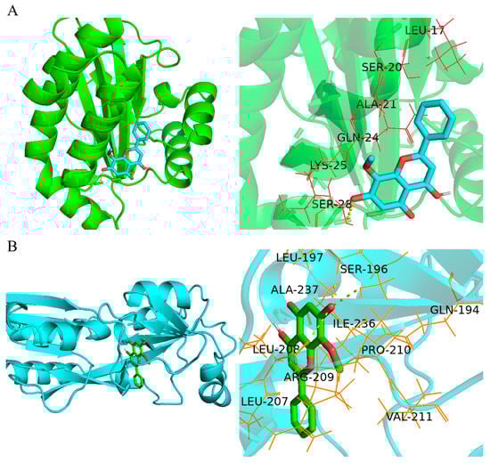 In silico molecular docking analysis. (A) The active sites of LasR CBD (PDBID:6D6A) docked with wogonin, including Ala, Ser, Gln, Leu, Lys, and Ser, and the binding energy is −2.44 kcal/mol. (B) The active sites of PqsR CBD (PDBID: 4JVI) docked with wogonin, including Ala, Arg, Ile, Pro, Val, and Gln, and the binding energy is −4.49 kcal/mol. 3D and 3D partial enlarged graphics were exhibited from left to right. Molecular docking was performed using Autodock Vina v.1.1.2, and graphics were generated with PyMOL v2.4.1 software.