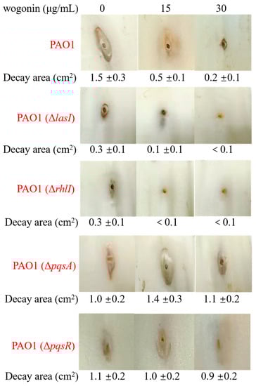 The decay area of cabbage after infection by various QS deletion mutants without or with 15 and 30 μg/mL wogonin, including PAO1 wild type strain, PAO1(ΔlasI), PAO1(ΔrhlI), PAO1(ΔpqsA), and PAO1(ΔpqsR). The errors represent standard errors.