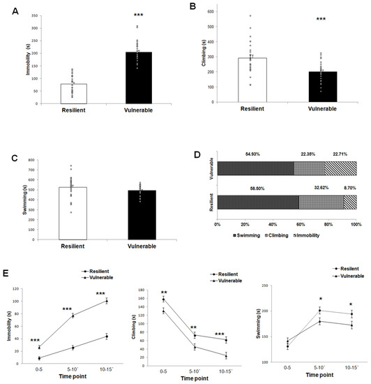 The percentage of the three behaviors analyzed for the two behavioral phenotypes showed that vulnerable rats spent more time in passive behavior (immobility) than resilient rats (22.71% in vulnerable vs. 8.70% resilient) but less time in active behaviors (swimming + climbing, 77.28%) when compared to the resilient group (91.12%) (Figure 1D). In addition, the total time for immobility, climbing, and swimming for the 15 min of forced swimming was compared between behavioral phenotypes.