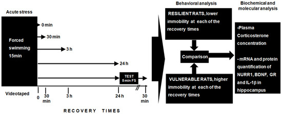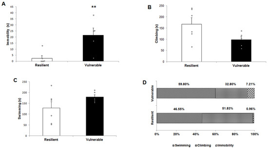 It should be noted that the rats were exposed to a single forced swimming session, to classify an individual behavioral phenotype to acute stress. Therefore, according to their behavioral response rats were classified as vulnerable (high immobility) or resilient (low immobility), at each of the recovery times (Figure 6). After collecting the measurements, the animals were classified based on the median immobility time. Rats above this value were designated as vulnerable, while the rest of the rats were assigned to the resilient group. This classification has been previously reported mainly based on the behavioral response during a second forced swim session of 5 min [35,36]. On this basis, we identify two clearly divergent groups in terms of behavioral response.