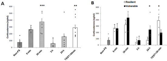 Plasma corticosterone concentrations after different recovery times following acute stress induced by forced swimming test. (A) Comparison between the different recovery times for the FS group; 6–8 rats per group, • individual values, ** p < 0.01 and *** p < 0.001 compared to Non-FS animals. (B) Responses differed between the vulnerable and resilient rats at different recovery times; 3–5 rats per group, ᵒ individual values. * p < 0.05 indicates significant differences between the resilient and vulnerable groups. Differences were analyzed with a two-way ANOVA followed by Bonferroni post hoc tests. Data are expressed as the mean ± SEM. FS, forced swimming.