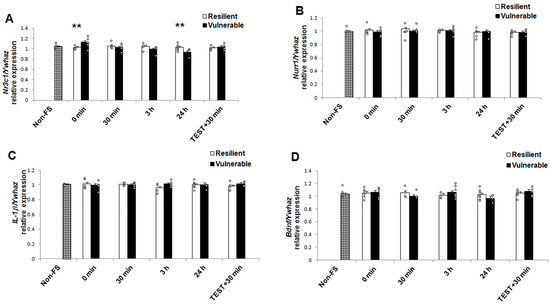 Vulnerability to forced swimming-induced acute stress is associated with higher Nr3c1 mRNA levels than resilience after 24 h of recovery from acute stress (panel 4A) in hippocampus. There were no differences in the levels of Nurr1, IL-1β, and BDNF mRNA between the two groups at any of the times analyzed (panel 4B–D). Data are expressed as the mean ± SEM. 4–9 rats per group. Differences were analyzed with a two-way ANOVA followed by Bonferroni post hoc tests. ** p < 0.01 compared to the respective resilient group. Nr3c1, the gene that encodes for glucocorticoid receptor; BDNF, brain-derived neurotrophic factor; IL-1β, interleukin-1 beta; ᵒ individual values.
