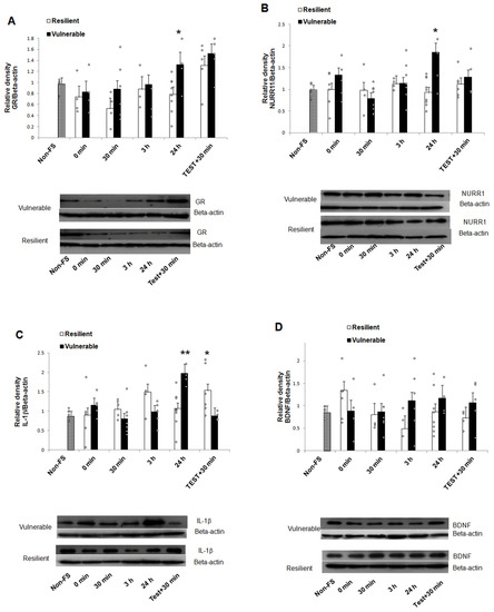 Additionally, the immobility behavior in a second exposure to forced swimming persisted showing higher immobility in the vulnerable group vs. resilient. It has been reported that this behavior can persist up to 4 weeks [55] and involves neuroplasticity processes in the hippocampus. In particular, we found no changes in mRNA or protein of GR, Nurr1 and BDNF except an increase in IL-1β in the resilient group after the second exposure to forced swim test.
