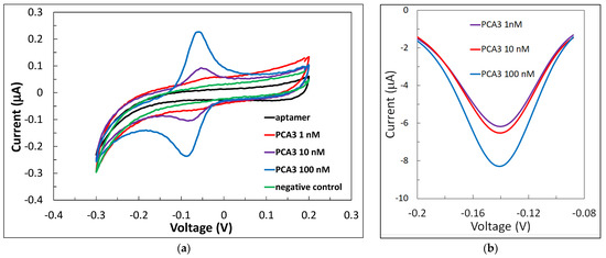 (a) A series of CV curves for a 1 μM aptamer layer immobilized on the surface of the SPE before and after binding PCA3 of different concentrations, including a negative control; (b) DPV curves for different concentrations of PCA3 bound to the aptamer.