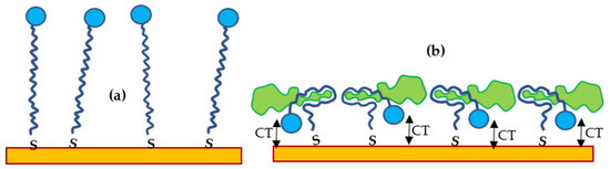 Schematic diagram of redox-labeled aptamers (blue circle) immobilized on the surface of gold before (a) and after binding the PCA3 target (green shape), which causes an increase in the charge transfer (CT) (b).