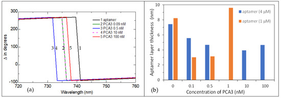 The typical series of the TIRE Δ spectra for the aptamer layer of 4 μM are shown in Figure 3a. The Δ spectra appear to be blue shifted up to a PCA3 concentration of 10 nM, which corresponds to a decrease in the aptamer layer thickness. Then, at the high concentration of PCA3 (100 nM), a red spectral shift occurs, corresponding to an increase in the thickness. The values of thickness of the aptamer layer were found by fitting the TIRE spectra to a four-layer model BK7 glass (prism)/Cr-Au metal layer/aptamer layer/aqueous medium (buffer). The data fitting procedure is explained in detail in our previous publications, for example, [28]. The optical constants of materials: BK7 glass, buffer solution, Cr and Au, were used from the J.A. Woollam library available within VWASE or CompleteEASE software, while the refractive index (n) of the aptamer layer is described by the Cauchy model: with fixed parameters: , which gives n = 1.42, typical for the majority of proteins and polynucleotides including aptamers. The extinction coefficient k = 0 was used since the aptamer layer was optically transparent in the spectral range used [28].