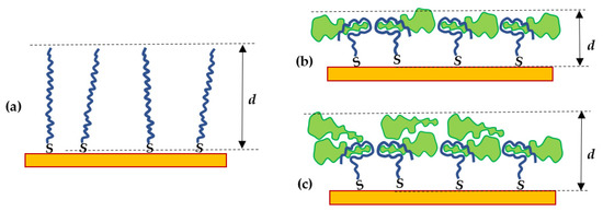 Schematic of a layer (with the thickness d) of non-labeled aptamers immobilized on the surface of gold before (a) and after binding the PCA3 target (green shapes) accompanied by decreasing d (b); the case of non-specific adsorption of PCA3 causes an increase in d (c).