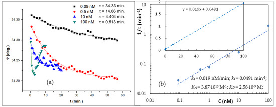 (a) Time dependencies of Ψ at 700 nm during the binding of PCA3 at different concentrations to the 4 μM aptamer; (b) evaluation of the affinity constant from 1/τ vs. C dependance.