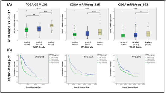 Figure 1. Elevated GRPEL2 expression correlated with higher tumor grade and poorer prognosis in gliomas. (A) The boxplots showing GRPEL2 gene expression correlate with the WHO grade of glioma patients in the TCGA and CGGA databases. ** p < 0.01, *** p < 0.001 (B) Kaplan–Meier graphs of GRPEL2 mRNA expression level (high-expression versus low-expression groups) compared the survival probability from the TCGA and CGGA datasets. The plotted Kaplan–Meier curvatures used the log-rank test and the one-way ANOVA used for evaluating grade versus GRPEL2 (p < 0.001 for TCGA data; p = 0.013 for CGGA mRNAseq_325 and p = 0.009 for CGGA mRNAseq_693 datasets, respectively).