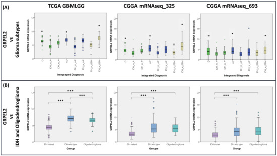 Figure 2. Elevated GRPEL2 expression correlated with oligodendroglial differentiation and IDH status. (A) The boxplots showing GRPEL2 mRNA expression correlate with phenotypes of oligodendroglioma (O), diffuse astrocytoma (A), anaplastic oligodendroglioma (AO), anaplastic astrocytoma (AA), and GBM in the TCGA and CGGA datasets. IDH status annotation: W (wide type) and M (mutant). * p < 0.05. (B) Graphs of GRPEL2 mRNA expression level association with oligodendroglial differentiation and IDH status in the TCGA and CGGA datasets. *** p < 0.001.