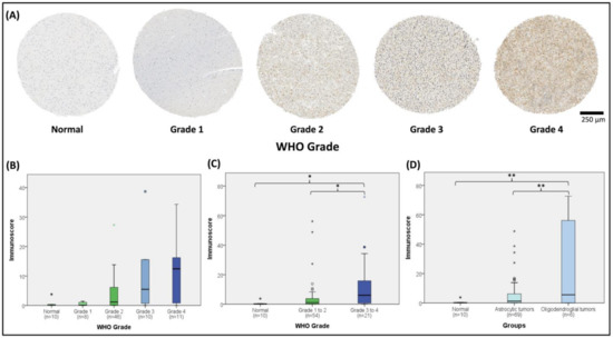 2.3. GRPEL2-Stained Microarray Correlated with WHO Grade and Oligodendroglial Differentiation in Glioma Tissues