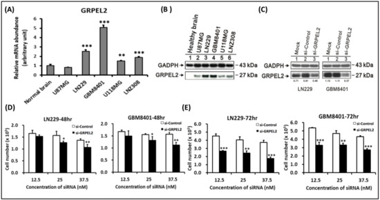 Figure 4. GRPEL2 expression was enhanced in glioma cell lines and GRPEL2 suppression inhibited cell survival. (A) Quantitative RT-PCR analysis of GRPEL2 mRNA abundance in healthy brain tissue and the U87MG, the LN229, the GBM8401, the U118MG, and the LNZ308 glioma cells. ** p < 0.01, *** p < 0.001. (B) Western blotting analysis of GRPEL2 expression in healthy brain tissue and U87MG, LN229, GBM8401, U118MG, and LNZ308 glioma cells. (C) A representative Western blot validated the effect of GRPEL2 knockdown in LN229 and GBM8401 glioma cells. (D,E) Quantitative validation of siGRPEL2 to inhibit the cellular numbers (×105) of LN229 and GBM8401 glioma cells at the concentration of 12.5 nM, 25 nM, and 37.5 nM siGRPEL2 in contrast to siControl treatment for 48 and 72 h. * p < 0.05, ** p < 0.01; *** p < 0.001.