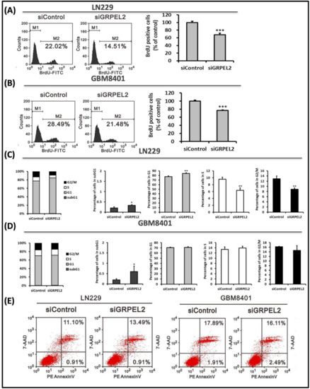 Figure 5. Effect of siGRPEL2 on cellular proliferation and apoptosis of LN229 and GBM8401 cells. (A,B) FITC-labeled anti-BrdU staining of LN229 (A) and GM8401 (B) cells after incubation with siControl and siGRPEL2 at 25 nM concentration analyzed by flow cytometry. M1 corresponds to the negative control and M2 to the positively stained cells (cell fractions expressed in percentage). Percentage of BrdU positive cells after treatment with siControl and siGRPEL2 of LN229 cell lines. *** p < 0.001. (C,D) The cell cycle profiling of LN229 (C) and GBM8401 (D) cells was shown. Note that GRPEL2 suppression increased cell fraction in the subG1 phase in both LN229 cells (C) and GBM8401 cells (D). * p < 0.05; ** p < 0.01. (E) Flowcytometric apoptosis assay of LN229 and GBM8401 cells treated with siGRPEL2 after 7-AAD/PE Annexin V staining. The apoptotic cells (early and late stages) were detected by FCS and represented as a percentage. The data are representative of two independent experiments.