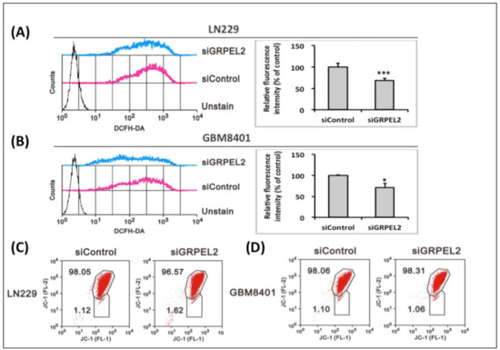 Figure 7. Effect of GRPEL2 knockdown on intracellular ROS and mitochondrial membrane potential (mt-MP) in glioma cells. (A,B) The LN229 (A) and GBM8401 (B) cells were treated with 25 nM siGRPEL2 for 24 h and stained with 2′-7′-dichlorodihydro fluorescein diacetate (DCFH-DA). The variation of the intracellular fluorescence intensity of LN229 and GBM8401cells was determined using flow cytometry (left panel). Relative fluorescence intensity analyses are shown on the right panel. * p < 0.05 *** p < 0.001. (C,D) Measure of mt-MP of LN229 (C) and GBM8401 (D) cells administrated with siGRPEL2 (25 nM) for 48 h by JC-1 assay. The data are representative of two independent experiments.