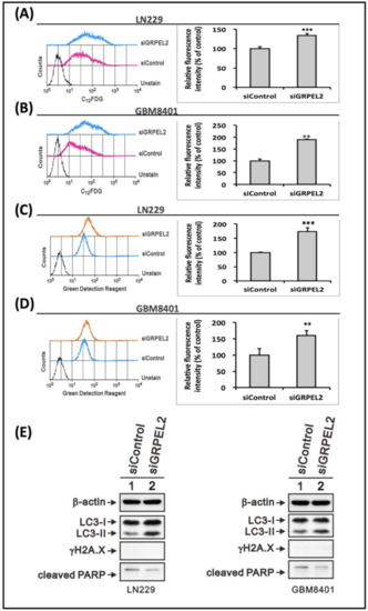 2’-7’-dichlorodihydrofluorescein-diacetate (DCFH-DA) penetrates cells and becomes hydrolyzed to non-fluorescent dichlorodihydrofluorescein (DCFH). DCFH reacts with ROS to form the highly fluorescent dichlorofluorescein (DCF), which can be measured by a flow cytometry. Briefly, LN229 and GBM8401 glioma cells were plated in 6-well plates at a density of 1 × 105 cells/well and incubated overnight, after which they were transfected with siGRPEL2 or siControl as described above. After incubation for an additional 24 h, the cells were incubated with 10 μM DCFH-DA (Sigma, St. Louis, MO, USA) for 10 min at 37 °C in the dark and washed twice with DPBS. ROS levels were analyzed using a flow cytometer (FACSCalibur, BD Biosciences, San Diego, CA, USA). For the flow-cytometry-based detection of senescence, the cells were exposed to siGRPEL2 for 48 h. Thereafter, 33 µM C12FDG (Molecular Probes, Eugene, OR, USA) was added and incubated for 60 min at 37 °C. The medium was removed, and the cells were washed with PBS, trypsinized, and resuspended in PBS. Senescence was measured at the BD FACSCalibur flow cytometer. For the flow cytometry–based detection of autophagy, the cells were exposed to siGRPEL2 for 48 h. Thereafter, 33 µNM green detection reagent in the fluorescence of tagged LC3 (Molecular Probes, USA) was added and incubated for 60 min at 37 °C. The medium was removed, and the cells were washed with PBS, trypsinized, and resuspended in PBS. Autophagy was measured at the BD FACSCalibur flow cytometer.