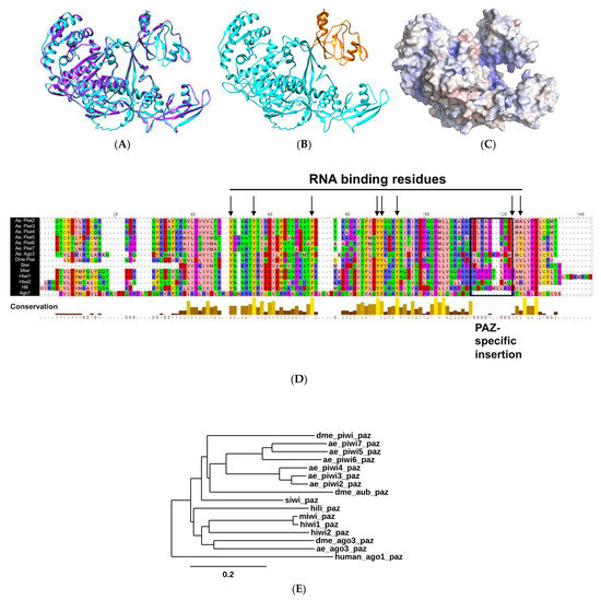 Predicted A. aegypti Piwi4 RNA-binding properties. (A) Predicted A. aegypti Piwi4 model (blue) superimposed with the crystalized Drosophila Piwi structure (purple); (B) predicted A. aegypti Piwi4 structure (blue) with PAZ domain highlighted in orange; (C) electrostatic density of A. aegypti Piwi4 where red = negatively charged and blue = positively charged. Structure is rotated on the right to reveal inner positively charged pocket; (D) alignment of Piwi PAZ domains, including all A. aegypti Piwis (Ae. Piwi2-7 and Ae. Ago3) and crystalized or characterized Piwi PAZ (Drosophila (Dme) Piwi, silkworm Piwi (Siwi), mouse Piwi (Miwi), and human Piwis Hiwi1, Hiwi2, and Hili). The human Argonaute protein Ago1 was also included as an outgroup. Black arrows indicate known RNA-binding residues by crystal structures, which in this alignment include amino acid numbers 50, 56, 71, 88, 89, 93, 123, and 125. Black box indicates the Piwi PAZ-specific insertion site. Colors (Zappo color scheme) indicate biochemical properties where peach = aliphatic/hydrophobic, aromatic = orange, blue = positively charged, red = negatively charged, green = hydrophilic, pink = conformationally special, and yellow = cysteine; (E) phylogenetic tree of all Piwi PAZ included in the alignment shown in 1D, with the addition of Drosophila Aubergine and Ago3 PAZs. Scale bar indicates number of substitutions per site.