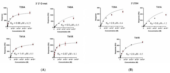 For further insights into how the AePiwi4 PAZ structure dictates its RNA-binding preferences, we generated AePiwi4 PAZ mutants that displayed amino acid changes within predicted RNA-binding pockets. We focused our efforts around two highly conserved residues shown to form hydrogen bonds with RNA—Y40 and F55—as well as two residues that flank Y40 and appeared to be moderately conserved across the A. aegypti Piwi PAZ—T39 and T41. Through site-directed mutagenesis, we generated five mutants that we then expressed in bacteria and purified: T39A, Y40A, T41A, F55A, and T41R (Supplemental Figures S3 and S4). Y40A and F55A displayed alanine substitutions for the highly conserved tyrosine or phenylalanine amino acids, respectively, while T39A and T41A displayed alanine substitutions for the threonines that flank Y40. The T41R mutation reflected the arginine present in only one A. aegypti Piwi, Ago3, but also in most other organisms’ Piwi PAZ domains analyzed herein (Figure 1D). Inserts were confirmed by Sanger sequencing, and mutations in protein sequence were confirmed by mass spectrometry. Binding behaviors were assessed by SPR, as described previously (Figure 3).