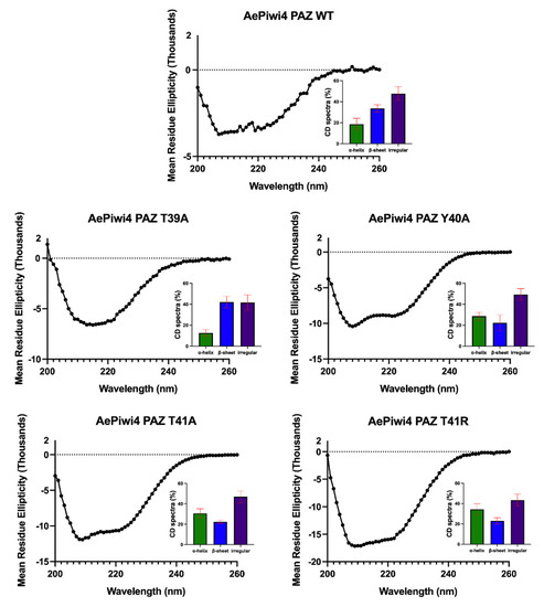 Circular dichroism (CD) spectra analyses of AePiwi4 PAZ mutants. CD spectra curves, by mean residue ellipticity for AePiwi4 PAZ WT and mutant proteins, recorded over 200–260 nm. Insets show the calculated percentages of secondary structures determined by CD analysis using CAPITO. Red bars indicate mean and standard deviation of three similarity hits based on lowest area differences under the curve.