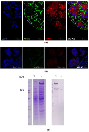 30 μg of protein was processed for SDS/PAGE separation, as described previously, and run alongside 10 µM Piwi4 PAZ or Piwi4 FL inclusion bodies. Proteins were transferred to a PVDF membrane (iBlot, Invitrogen, Waltham, MA, USA) that was blocked for 2 h at RT in blocking buffer (5% powdered milk (Carnation), 50 mM Tris-HCl pH 7.4, 150 mM NaCl, 1% Tween 20 (TBST)). Membranes were incubated O/N at 4 °C with anti-Piwi4 PAZ mouse serum (1:500 in blocking buffer), a 6xHis-tag monoclonal antibody (ThermoFisher Scientific, Waltham, MA, USA, diluted 1:5000 in blocking buffer), or anti-Histone H3 as a nuclear marker (Novus Biologicals, Littleton, CO, USA; generated in rabbit, diluted 1:1000 in blocking buffer).