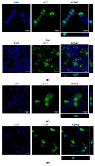 To confirm that the putative AePiwi4 NLS was responsible for protein nuclear localization, we cloned the putative AePiwi4 NLS (amino acid residues 42–83, Supplemental Figure S8A), as well as the entire N-terminal region containing the NLS (amino acid residues 1–83), fused to an eGFP; we henceforth named these constructs AePiwi4NLS-eGFP and AePiwi4Nterminal-eGFP, respectively. We used the same backbone containing either a known SV40 NLS fused to the eGFP [52] as a positive control or an eGFP alone as a negative control; we henceforth named these constructs SV40NLS-eGFP and eGFP, respectively. We then transfected HEK293 cells with these constructs and visualized eGFP and DAPI colocalization 24 h post-transfection. As expected, we found that the known SV40NLS-eGFP localized in the nucleus while the eGFP alone appeared diffused throughout the cells (Figure 6A,B). Plasmids harboring either AePiwi4NLS-eGFP or AePiwi4Nterminal-eGFP migrated into the nucleus, as evidenced by eGFP expression colocalized with DAPI staining (Figure 6C,D). The nuclear staining appeared punctated, perhaps indicative of nucleolar staining. We also observed that both AePiwi4NLS-eGFP and AePiwi4Nterminal-eGFP displayed cytoplasmic eGFP expression as well, which was not observed in cells transfected with the SV40 NLS plasmid (Figure 6C,D).