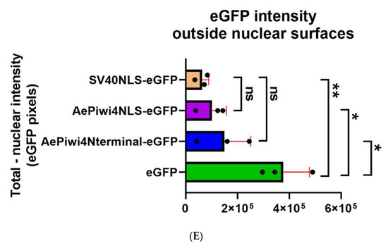 The putative AePiwi4 NLS, as well as the entire N-terminal region of AePiwi4 containing the putative NLS, were cloned from the AePiwi4 FL-containing pCR-Blunt II-TOPO vector into a backbone containing an eGFP by In-Fusion cloning (TakaRa, San Jose, CA, USA) following the manufacturer’s instructions. The parent SV40NLS-eGFP backbone was a gift from Rob Parton (Addgene plasmid # 67652; http://n2t.net/addgene:67652 (accessed on 28 April 2021); RRID: Addgene_67652) [52]. Briefly, an eGFP-alone plasmid was generated by NcoI digestion and religation with the T4 DNA ligation Mighty Mix (TakaRa, San Jose, CA, USA) of the SV40NLS-eGFP plasmid. AePiwi4NLS-eGFP or AePiwi4Nterminal-eGFP were then cloned into the eGFP alone plasmid using In-Fusion primers listed in Supplemental Table S3. All constructs were transformed into Stellar Competent Cells (TakaRa, San Jose, CA, USA), and inserts were confirmed by Sanger sequencing.