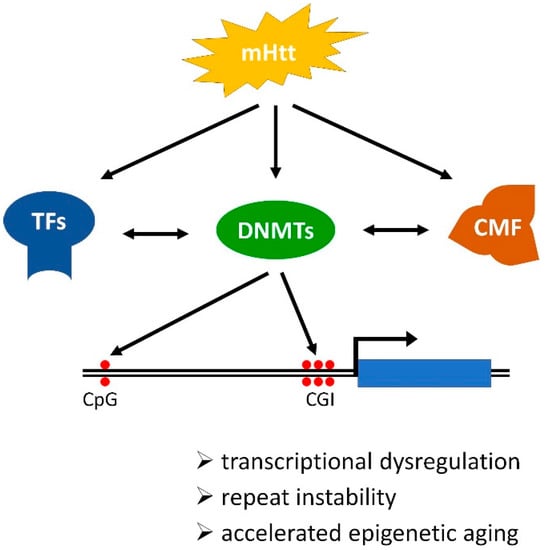 HD is characterized by multifaceted pathogenesis that includes alterations of the chromatin landscape. mHtt provokes changes in the level or activity of transcriptional factors, chromatin-modifying factors, and enzymes involved in CpG methylation (DNMTs) and demethylation (TETs) directly or indirectly. The concerted action of these factors leads to complex changes in DNA methylation in HD, that include simultaneous hyper- or hypomethylation of specific CpG sites residing in different parts of the genome including both CpG poor intergenic regions and TSS proximal CGIs. These changes in DNA methylation contribute to HD pathology by affecting DNA-dependent processes and thereby accelerating epigenetic aging, destabilizing trinucleotide repeats and mobile genetic elements, and modifying the transcriptional activity of genes (Figure 2). Certain differentially methylated CpG sites, for example, cg22982173 in HTT itself, might prove to be useful biomarkers, and the fact that some DNMT inhibitors that are FDA approved for the treatment of other ailments ameliorate some aspects of HD pathology are especially encouraging. It is important to remember, however, that interfering with epigenetic mechanism might prove to be a double-edged sword, that on the one hand improves some aspects of HD pathology (e.g., reduced trinucleotide repeat instability and improved BDNF levels), while on the other hand makes other aspects worse (e.g., increased instability of LINE-1 elements and hypomethylation of HTT that correlates with disease progression). Thus, although modulation of DNA methylation holds the promise of therapeutic use better understanding of the involved and affected processes is needed to be able to estimate the risks and benefits of potential treatment options and achieve planned outcomes.