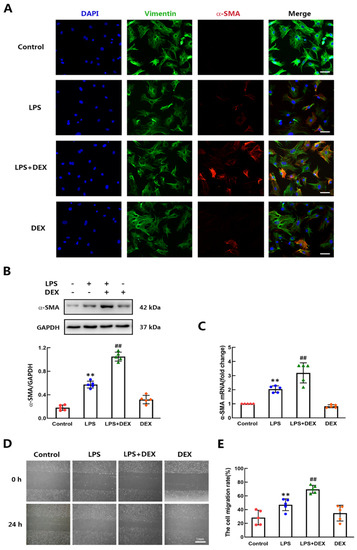 LPS is a potent inducer of fibroblast-to-myofibroblast differentiation, which is characterized by the high expression of α-SMA [6]. To determine the effect of DEX on LPS-induced differentiation of CFs to myofibroblasts, the protein expression of α-SMA in the LPS-administered CFs with or without DEX treatment was first detected by immunofluorescence staining and western blot. Previous reports have shown that CFs spontaneously differentiate into myofibroblasts under standard culture conditions [24]. Therefore, we performed our studies with no-passage fibroblasts. The fibroblastic phenotype was retained without LPS stimulation, as indicated by the low expression of α-SMA. As expected, the CFs treated with LPS for 24 h exhibited an increase in α-SMA expression compared with the control group. We observed a drastic upregulation of α-SMA expression in the DEX plus LPS-treated CFs compared to the LPS alone group. DEX slightly increased the expression of α-SMA in CFs without LPS stimulation, but the increase was not statistically significant (Figure 1A,B). We also measured the mRNA level of α-SMA in CFs after DEX stimulation for 12 h by using qPCR. The results showed that the mRNA level of α-SMA in CFs was much higher in the DEX plus LPS group than in the LPS group (Figure 1C). Activated fibroblasts migrate to the injured area, and the migration capacity of the fibroblasts can be assessed by the conventional scratch healing assay. In this study, the results showed that the treatment with LPS tended to reduce the cell-free scratch area. Furthermore, the LPS-mediated effect on migration capacity of CFs was significantly enhanced by DEX treatment (Figure 1D,E). These results indicated that DEX promotes LPS-induced differentiation of CFs to myofibroblasts in mice.