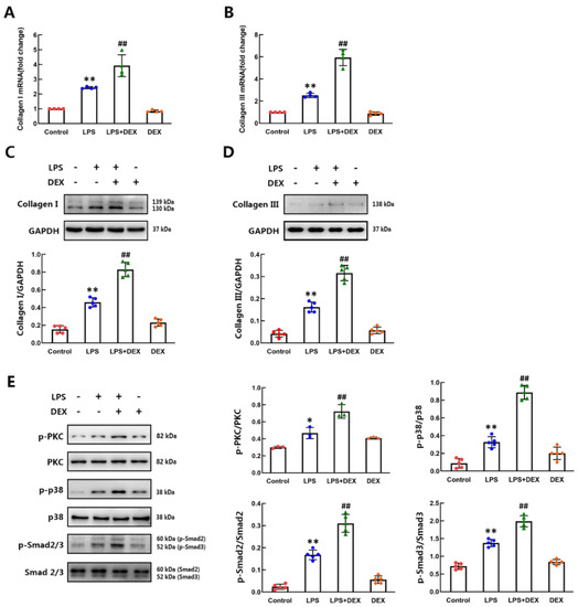 DEX accelerated collagen I/III synthesis and phosphorylation of PKC, p38 and Smad2/3 in CFs after LPS stimulation. (A,B) The mRNA levels of collagen I and collagen III in CFs after LPS and/or DEX stimulation for 12 h were detected by qPCR. (C,D) The protein levels of collagen I and collagen III in CFs treated with LPS and/or DEX for 24 h were measured by western blot. (E) The phosphorylation of PKC, p38 and Smad2/3 in CFs after LPS and/or DEX administration was detected by Western blot. Quantification of the relative protein levels in the panels next to the images. Mean ± standard error of the mean (n = 3–5). * p < 0.05, ** p < 0.01 versus control group. ## p < 0.01 versus LPS group.