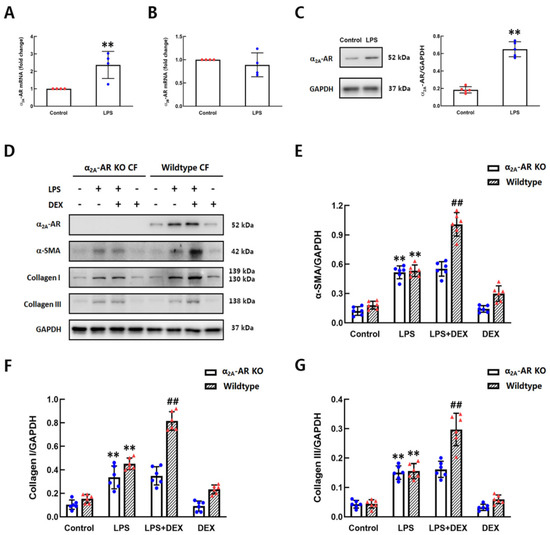 The α2-ARs have been divided into three subtypes: α2A-AR, α2B-AR and α2C-AR. Previous studies have reported that only α2A-AR mRNA, but not αB-AR or α2C-AR, was detected in cultured adventitial fibroblasts of rat aortae [23]. To confirm the expression of α2-AR subtypes in CFs of mice, the mRNA levels of α2A-AR, α2B-AR and α2C-AR in CFs with and without LPS stimulation for 2 h were measured by qPCR. The mRNA expression of both α2A-AR and α2B-AR was detected, but α2C-AR was undetectable. Compared with control CFs, the mRNA level of α2A-AR was increased in LPS-treated CFs (Figure 3A,B). We also detected the protein level of α2A-AR in CFs after LPS administration for 6 h. As depicted in Figure 3C, the protein expression of α2A-AR was markedly higher in the LPS group than in the control group. To further investigate whether the facilitating effect of DEX on the differentiation of CFs is dependent on α2A-AR, CFs were isolated from wild-type and α2A-AR knockout (KO) mice, then treated with DEX and/or LPS. The CFs of α2A-AR KO mice treated with LPS showed significantly increased expression of α-SMA and collagen I/III, which are major markers of myofibroblasts. However, unlike the CFs of wild-type mice, DEX had no effect on the LPS-induced upregulation of α-SMA and collagen I/III in the CFs of α2A-AR KO mice (Figure 3D–G). It means that the effect of DEX on promoting LPS-induced differentiation of CFs into myofibroblasts is α2A-AR-dependent.