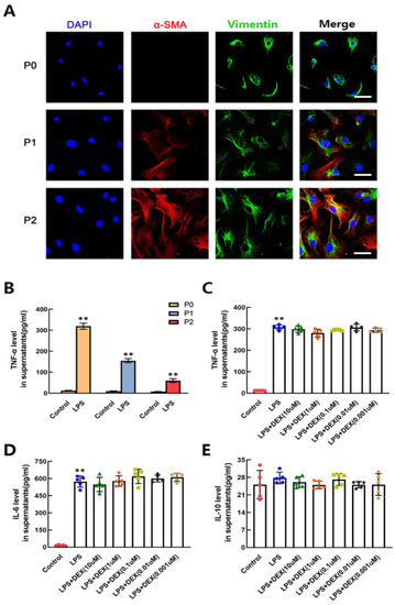 The accelerating effect of DEX on LPS-induced CF differentiation was TNF-α and IL-6 independent. (A) Immunofluorescent staining of primary CFs from nonpassage (P0) to second passage (P2). Scale bar = 100 μm. (B) The contents of TNF-α in CFs at different passages were determined by ELISA 24 h after LPS challenge. (C–E) The influence of DEX on TNF-α, IL-6 and IL-10 release from primary CFs treated with LPS. Mean ± standard error of the mean (n = 5). ** p < 0.01 versus the control group.