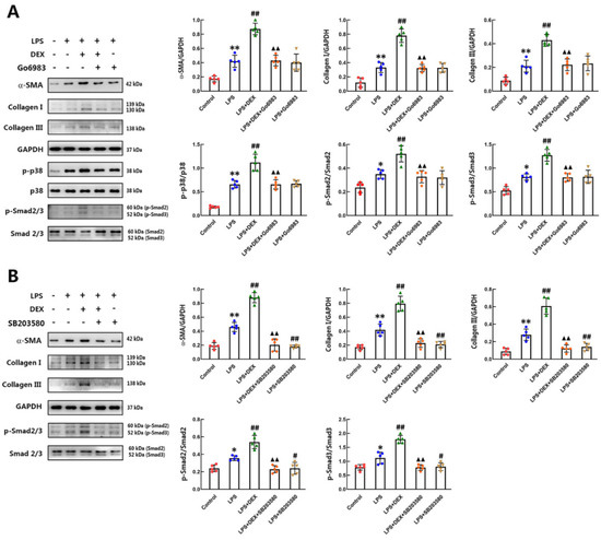 The effects of PKC and p38 inhibitor on DEX-promoted differentiation of CFs after LPS stimulation. (A) The PKC inhibitor Go6983 was used to treat CFs 30 min prior to DEX and LPS stimulation. The expression of α-SMA and collagen I/III, as well as the phosphorylation of p38 and Smad2/3, were detected by Western blot. (B) CFs were preincubated with SB203580, a selective inhibitor of p38, for 30 min before treatment with LPS and DEX. The levels of α-SMA, collagen I/III and phosphorylation of Smad2/3 were measured by Western blot analysis with antibodies binding to the proteins. Quantitative analyses of the relative protein levels are plotted in the panels on the right of image. Mean ± standard error of the mean (n = 5). * p < 0.05, ** p < 0.01 versus control group. # p < 0.05, ## p < 0.01 versus LPS group. ▲▲ p < 0.01 versus LPS + DEX group.
