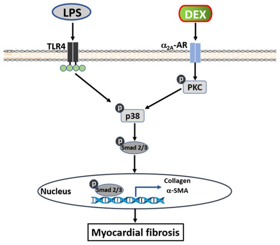 Proposed signaling mechanisms of DEX promote LPS-induced differentiation of CFs and cardiac fibrosis. DEX initiates α2A-AR-mediated activation of PKC, which accelerates LPS-induced phosphorylation of p38 and Smad2/3 in CFs. This subsequently upregulates α-SMA and collagen I/III expression, resulting in cardiac fibrosis.