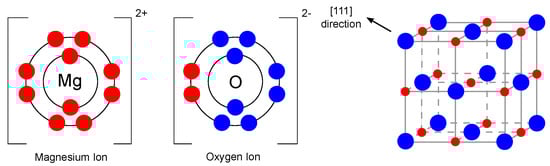Electronic configuration of Mg and O ions and crystal structure of MgO (redrawn and adapted from [23,25]).