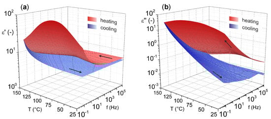 Temperature–frequency dependence of complex permittivity: (a) real part and (b) imaginary part (reprinted from article [46] distributed under the terms and conditions of the Creative Commons Attribution (CC BY) license).