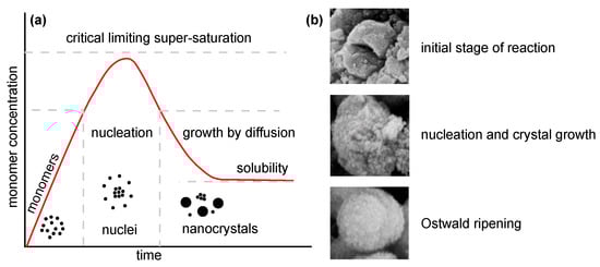 Illustration of nanoparticle growth: (a) LaMer model of nucleation and growth (redrawn and adapted from [64,65]) and (b) phases of growth (reprinted from article [66] distributed under the terms and conditions of the Creative Commons Attribution (CC BY) license).