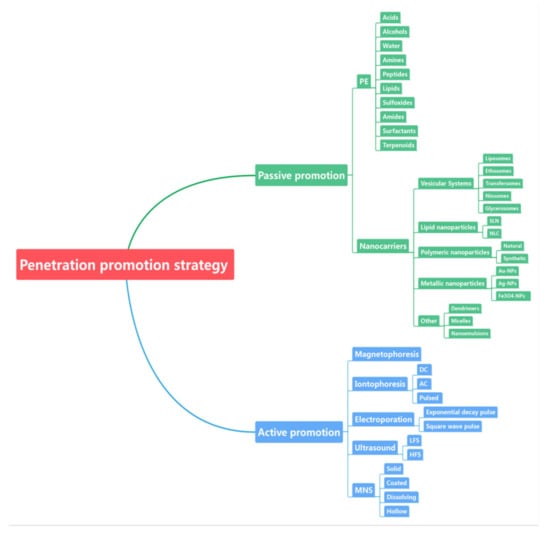 The most common passive methods to improve skin permeability include the use of penetration enhancers (PE) and the use of nanocarriers to carry drugs into the skin [15,65,66,67,68].