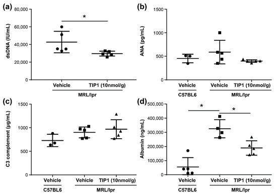 (a) Anti-dsDNA antibodies, (b) anti-nuclear antibodies (ANA), (c) C3 complement levels in the serum, and (d) albumin content in the urine as determined by enzyme-linked immunosorbent assays (ELISAs). All experiments were performed in duplicate wells (n = 4–5 mice/group). The exact Mann–Whitney U test was performed to compare the mean values between groups. * p < 0.05. TIP1, Toll-like receptor inhibitor peptide 1.