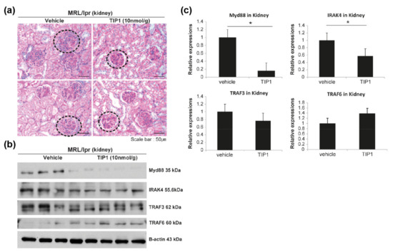 All animal experiments were compliant with the ARRIVE guidelines and were carried out in accordance with the U.K. Animals (Scientific Procedures) Act, 1986 and associated guidelines, EU Directive 2010/63/EU for animal experiments, or the National Institutes of Health guide for the care and use of Laboratory animals (NIH Publications No. 8023, revised 1978). All animal procedures were reviewed and approved by the animal ethics committee of Ajou University Medical Center (Approval No. 2017-0022). Female C57BL/6J (B6J, wild-type, 19–20 g) and MRL/lpr (36–40 g) mice were purchased from the Jackson Laboratory (Bar Harbor, ME, USA). Mice were allowed to acclimatize for 1 week before experimentation and were maintained under pathogen-free conditions according to the guidelines of the animal facility issued by Ajou University School of Medicine. For experiments, mice from the control group received an intraperitoneal (i.p.) injection of vehicle (phosphate-buffered saline (Thermo Fisher Scientific, Waltham, MA, USA), 137 mM NaCl, 2.7 mM KCl, 8.1 mM NaH2PO4, 1.47 mM KH2PO4), while those from the TIP1 treatment group received a single daily i.p. injection of 10 nmol/g TIP1 for 4 weeks from 14 to 18 weeks of age. Each group had five animals. During the treatment period, mice were weighed once a week. At the end of the experimental period, mice were sacrificed, and their blood, urine, and organs were collected. Blood samples were left undisturbed for 1 h, and then collected into serum separation tubes and centrifuged at 1500× g for 10 min at 4 °C. Serum samples obtained were stored at −80 °C. Collected urine samples were immediately stored at −80 °C. SLE-targeted organs (the kidney, spleen, and lymph node) were rapidly excised, and tissue of average size of kidney, spleen, and lymph nodes from each group of mice was photographed as representative, thoroughly washed with PBS, and immersed in an RNA stabilization solution (QIAGEN Sciences, Maryland, MD, USA).